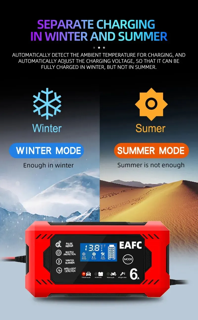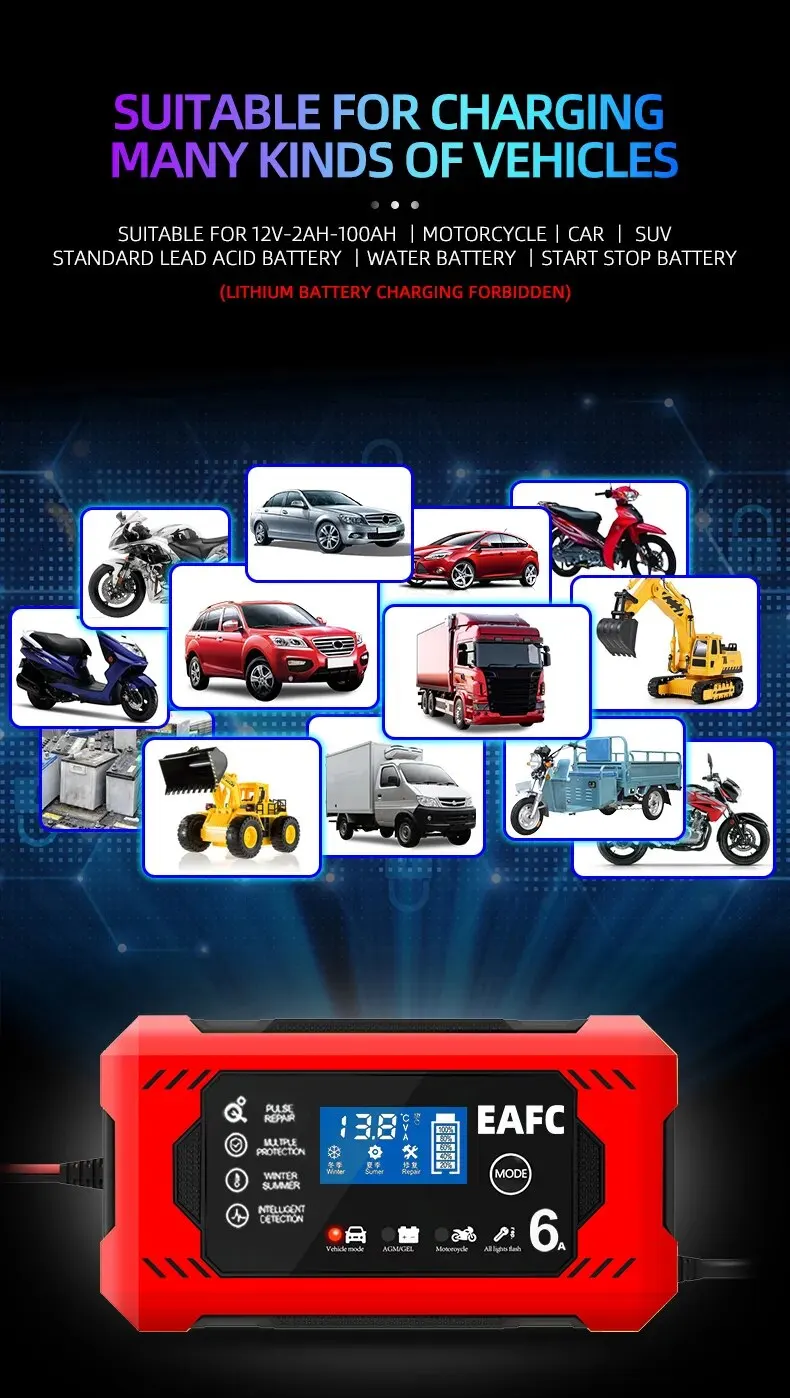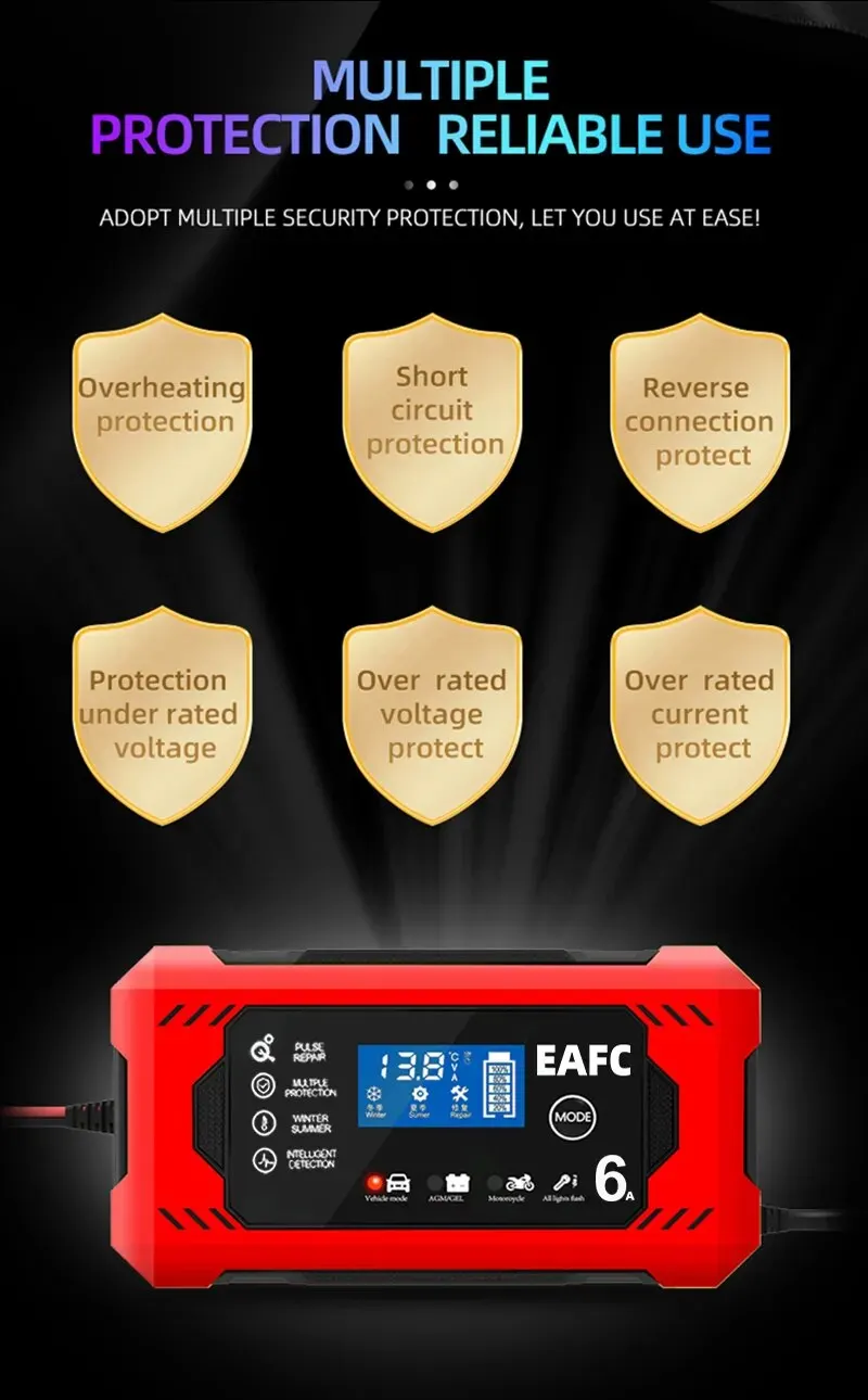 • 6A Charging Capacity :Charge your car or motorcycle battery quickly with a charging capacity of 6A.