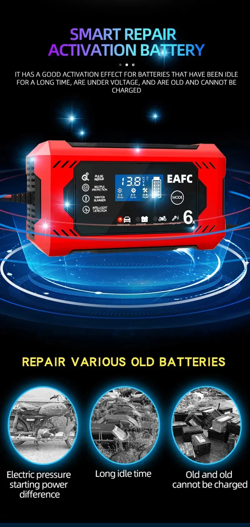 • 6A Charge Rate :Charge your car or motorcycle battery quickly with a 6A charge rate.